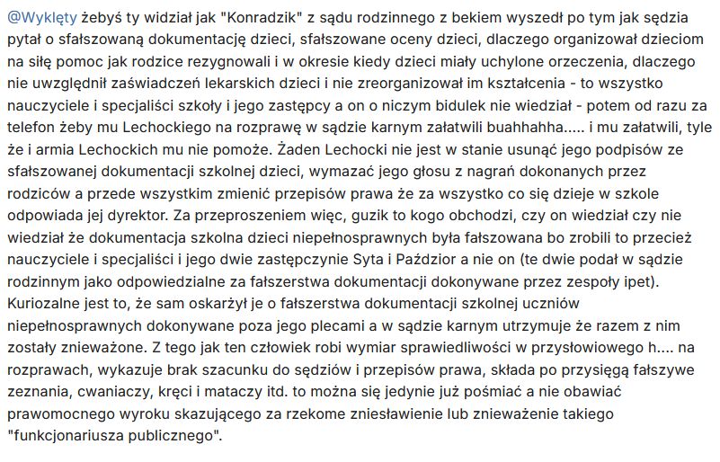 „żebyś ty widział jak „Konradzik” z sądu rodzinnego z bekiem wyszedł po tym jak sędzia pytał o sfałszowaną dokumentację dzieci, sfałszowane oceny dzieci, dlaczego organizował dzieciom na siłę pomoc jak rodzice rezygnowali i w okresie kiedy dzieci miały uchylone orzeczenia, dlaczego nie uwzględnił zaświadczeń lekarskich dzieci i nie zreorganizował im kształcenia – to wszystko nauczyciele i specjaliści szkoły i jego zastępcy a on o niczym bidulek nie wiedział – potem od razu za telefon żeby mu Lechockiego na rozprawę w sądzie karnym załatwili buahhahha….. i mu załatwili, tyle że i armia Lechockich mu nie pomoże. Żaden Lechocki nie jest w stanie usunąć jego podpisów ze sfałszowanej dokumentacji szkolnej dzieci, wymazać jego głosu z nagrań dokonanych przez rodziców a przede wszystkim zmienić przepisów prawa że za wszystko co się dzieje w szkole odpowiada jej dyrektor. Za przeproszeniem więc, guzik to kogo obchodzi, czy on wiedział czy nie wiedział że dokumentacja szkolna dzieci niepełnosprawnych była fałszowana bo zrobili to przecież nauczyciele i specjaliści i jego dwie zastępczynie Syta i Paździor a nie on (te dwie podał w sądzie rodzinnym jako odpowiedzialne za fałszerstwa dokumentacji dokonywane przez zespoły ipet). Kuriozalne jest to, że sam oskarżył je o fałszerstwa dokumentacji szkolnej uczniów niepełnosprawnych dokonywane poza jego plecami a w sądzie karnym utrzymuje że razem z nim zostały znieważone. Z tego jak ten człowiek robi wymiar sprawiedliwości w przysłowiowego h…. na rozprawach, wykazuje brak szacunku do sędziów i przepisów prawa, składa po przysięgą fałszywe zeznania, cwaniaczy, kręci i mataczy itd. to można się jedynie już pośmiać a nie obawiać prawomocnego wyroku skazującego za rzekome zniesławienie lub znieważenie takiego „funkcjonariusza publicznego”.”