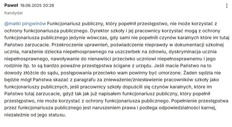 „Funkcjonariusz publiczny, który popełnił przestępstwo, nie może korzystać z ochrony funkcjonariusza publicznego. Dyrektor szkoły i jej pracownicy korzystać mogą z ochrony funkcjonariusza publicznego jedynie wówczas, gdy sami nie popełnili czynów karalnych które im tutaj Państwo zarzucacie. Przekroczenie uprawnień, poświadczenie nieprawdy w dokumentacji szkolnej ucznia, narażenie dziecka niepełnosprawnego na uszczerbek na zdrowiu, dyskryminacja ucznia niepełnosprawnego, nawoływanie do nienawiści przeciwko uczniowi niepełnosprawnemu i jego rodzinie itp. to są bardzo poważne przestępstwa ścigane z urzędu. Jeśli macie Państwo na to dowody złóżcie do sądu, postępowania przeciwko wam powinny być umorzone. Żaden sędzia nie będzie mógł Państwa skazać z paragrafu za znieważenie/zniesławienie pracowników szkoły jako funkcjonariuszy publicznych, jeśli pracownicy szkoły dopuścili się czynów karalnych, które im Państwo tutaj zarzucacie, gdyż tak jak już napisałem funkcjonariusz publiczny, który popełnił przestępstwo, nie może korzystać z ochrony funkcjonariusza publicznego. Popełnienie przestępstwa przez funkcjonariusza publicznego jest naruszeniem prawa i podlega odpowiedzialności karnej, niezależnie od jego statusu.”
