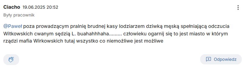 „poza prowadzącym pralnię brudnej kasy lodziarzem dziwką męską spełniającą odczucia Witkowskich cwanym sędzią L. buahahhhaha……… człowieku ogarnij się to jest miasto w którym rządzi mafia Wirkowskich tutaj wszystko co niemożliwe jest możliwe”