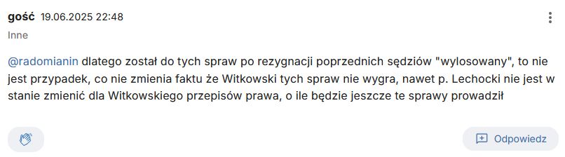 „dlatego został do tych spraw po rezygnacji poprzednich sędziów „wylosowany”, to nie jest przypadek, co nie zmienia faktu że Witkowski tych spraw nie wygra, nawet p. Lechocki nie jest w stanie zmienić dla Witkowskiego przepisów prawa, o ile będzie jeszcze te sprawy prowadził”