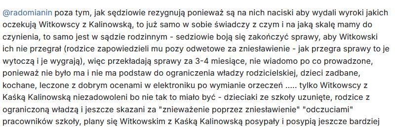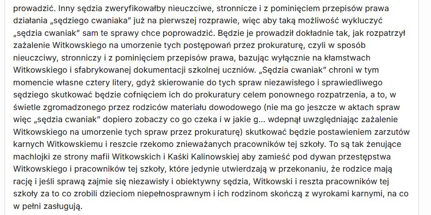 „poza tym, jak sędziowie rezygnują ponieważ są na nich naciski aby wydali wyroki jakich oczekują Witkowscy z Kalinowską, to już samo w sobie świadczy z czym i na jaką skalę mamy do czynienia, to samo jest w sądzie rodzinnym – sedziowie boją się zakończyć sprawy, aby Witkowski ich nie przegrał (rodzice zapowiedzieli mu pozy odwetowe za zniesławienie – jak przegra sprawy to je wytoczą i je wygrają), więc przekładają sprawy za 3-4 miesiące, nie wiadomo po co prowadzone, ponieważ nie było ma i nie ma podstaw do ograniczenia władzy rodzicielskiej, dzieci zadbane, kochane, leczone z dobrym ocenami w elektroniku po wymianie orzeczeń ….. tylko Witkowscy z Kaśką Kalinowską niezadowoleni bo nie tak to miało być – dzieciaki ze szkoły uzunięte, rodzice z ograniczoną władzą i jeszcze skazani za „znieważenie poprzez zniesławienie” „odczuciami” pracowników szkoły, plany się Witkowskim z Kaśką Kalinowską posypały i posypią jeszcze bardziej”