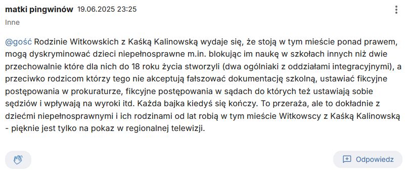 „Rodzinie Witkowskich z Kaśką Kalinowską wydaje się, że stoją w tym mieście ponad prawem, mogą dyskryminować dzieci niepełnosprawne m.in. blokując im naukę w szkołach innych niż dwie przechowalnie które dla nich do 18 roku życia stworzyli (dwa ogólniaki z oddziałami integracyjnymi), a przeciwko rodzicom którzy tego nie akceptują fałszować dokumentację szkolną, ustawiać fikcyjne postępowania w prokuraturze, fikcyjne postępowania w sądach do których też ustawiają sobie sędziów i wpływają na wyroki itd. Każda bajka kiedyś się kończy. To przeraża, ale to dokładnie z dziećmi niepełnosprawnymi i ich rodzinami od lat robią w tym mieście Witkowscy z Kaśką Kalinowską – pięknie jest tylko na pokaz w regionalnej telewizji.”
