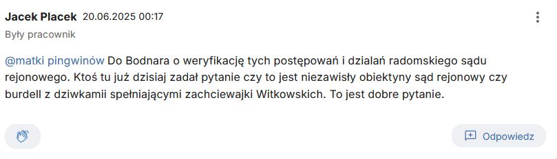 „Do Bodnara o weryfikację tych postępowań i dzialań radomskiego sądu rejonowego. Ktoś tu już dzisiaj zadał pytanie czy to jest niezawisły obiektyny sąd rejonowy czy burdell z dziwkamii spełniającymi zachciewajki Witkowskich. To jest dobre pytanie.”