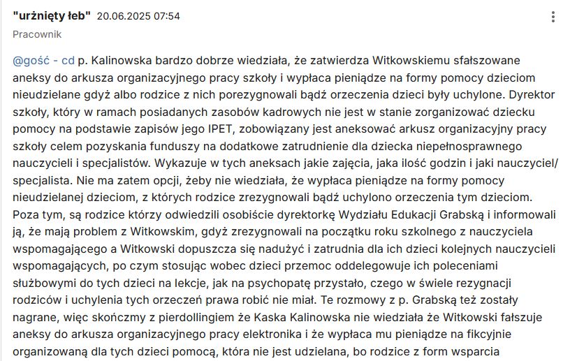 „p. Kalinowska bardzo dobrze wiedziała, że zatwierdza Witkowskiemu sfałszowane aneksy do arkusza organizacyjnego pracy szkoły i wypłaca pieniądze na formy pomocy dzieciom nieudzielane gdyż albo rodzice z nich porezygnowali bądź orzeczenia dzieci były uchylone. Dyrektor szkoły, który w ramach posiadanych zasobów kadrowych nie jest w stanie zorganizować dziecku pomocy na podstawie zapisów jego IPET, zobowiązany jest aneksować arkusz organizacyjny pracy szkoły celem pozyskania funduszy na dodatkowe zatrudnienie dla dziecka niepełnosprawnego nauczycieli i specjalistów. Wykazuje w tych aneksach jakie zajęcia, jaka ilość godzin i jaki nauczyciel/specjalista. Nie ma zatem opcji, żeby nie wiedziała, że wypłaca pieniądze na formy pomocy nieudzielanej dzieciom, z których rodzice zrezygnowali bądź uchylono orzeczenia tym dzieciom. Poza tym, są rodzice którzy odwiedzili osobiście dyrektorkę Wydziału Edukacji Grabską i informowali ją, że mają problem z Witkowskim, gdyż zrezygnowali na początku roku szkolnego z nauczyciela wspomagającego a Witkowski dopuszcza się nadużyć i zatrudnia dla ich dzieci kolejnych nauczycieli wspomagających, po czym stosując wobec dzieci przemoc oddelegowuje ich poleceniami służbowymi do tych dzieci na lekcje, jak na psychopatę przystało, czego w świele rezygnacji rodziców i uchylenia tych orzeczeń prawa robić nie miał. Te rozmowy z p. Grabską też zostały nagrane, więc skończmy z pierdollingiem że Kaska Kalinowska nie wiedziała że Witkowski fałszuje aneksy do arkusza organizacyjnego pracy elektronika i że wypłaca mu pieniądze na fikcyjnie organizowaną dla tych dzieci pomocą, która nie jest udzielana, bo rodzice z form wsparcia porezygnowali bądź orzeczenia są uchylone. Wiedziała i w pełni świadomie mu te sfałszowane arkusze zatwierdzała aby mógł dalej toczyć wojnę z dziećmi niepełnosprawnym i ich rodzinami, wykańczać te dzieci źle zorganizowaną pomocą (dostawał na to od Kalinowskiej pieniądze) oraz fałszować przeciwko nim za pomocą tak zatrudnianych znajomych królika dokumentację szkolną dzieci.