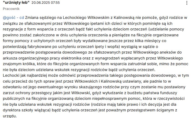 „Zmiana sędziego na Lechockiego Witkowskim z Kalinowską nie pomoże, gdyż rodzice w związku ze sfałszowanymi przez Witkowskiego ipetami ich dzieci w których pominięte są ich rezygnacje z form wsparcia z orzeczeń bądź fakt uchylenia dzieciom orzeczeń (udzielanie pomocy powinno zostać zakończone w dniu uchylenia orzeczenia a pieniądze na fikcyjnie organizowane formy pomocy z uchylonych orzeczeń były wydatkowane jeszcze przez kilka miesięcy co potwierdzają fabrykowane po uchyleniu orzeczeń ipety i wopfa) wystąpią w sądzie o przeprowadzenie postępowania dowodowego ze sfałszowanych przez Witkowskiego aneksów do arkusza organizacyjnego pracy elektronika oraz z wynagrodzeń wypłacanych przez Witkowskiego znajomym królika, które do fikcyjnie organizowanych form wsparcia zatrudniał sobie, mimo że pomoc nie była dzieciom udzielana wskutek rezygnacji rodziców bądź uchylenia orzeczeń.
