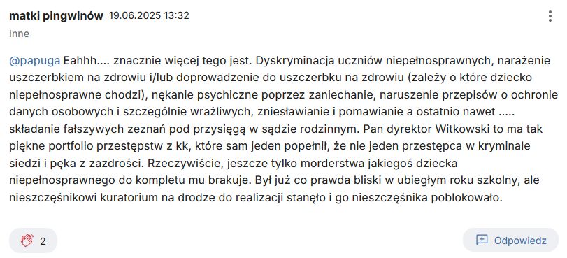 „Eahhh…. znacznie więcej tego jest. Dyskryminacja uczniów niepełnosprawnych, narażenie uszczerbkiem na zdrowiu i/lub doprowadzenie do uszczerbku na zdrowiu (zależy o które dziecko niepełnosprawne chodzi), nękanie psychiczne poprzez zaniechanie, naruszenie przepisów o ochronie danych osobowych i szczególnie wrażliwych, zniesławianie i pomawianie a ostatnio nawet ….. składanie fałszywych zeznań pod przysięgą w sądzie rodzinnym. Pan dyrektor Witkowski to ma tak piękne portfolio przestępstw z kk, które sam jeden popełnił, że nie jeden przestępca w kryminale siedzi i pęka z zazdrości. Rzeczywiście, jeszcze tylko morderstwa jakiegoś dziecka niepełnosprawnego do kompletu mu brakuje. Był już co prawda bliski w ubiegłym roku szkolny, ale nieszczęśnikowi kuratorium na drodze do realizacji stanęło i go nieszczęśnika poblokowało.”