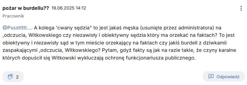„A kolega 'cwany sędzia” to jest jakaś męska (usunięte przez administratora) na ,odczucia, Witkowskiego czy niezawisły i obiektywny sędzia który ma orzekać na faktach? To jest obiektywny i niezawisły sąd w tym mieście orzekający na faktach czy jakiś burdell z dziwkamii zaspakającymi ,odczucia, Witkowskiego? Pytam, gdyż fakty są jak na razie takie, że czyny karalne których dopuścił się Witkowski wykluczają ochronę funkcjonariusza publicznego.”