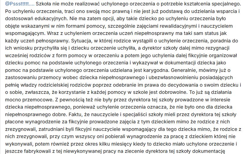 „Szkoła nie może realizować uchylonego orzeczenia o potrzebie kształcenia specjalnego. Po uchyleniu orzeczenia, traci ono swoją moc prawną i nie jest już podstawą do udzielania wsparcia i dostosowań edukacyjnych. Nie ma zatem opcji, aby takie dziecko po uchyleniu orzeczenia było objęte wskazanymi w nim formami pomocy, szczególnie zajęciami rewalidacyjnymi i nauczycielem wspomagającym. Wraz z uchyleniem orzeczenia uczeń niepełnosprawny ma taki sam status jak każdy uczeń pełnosprawny. Sytuacja, w której rodzice wystąpili o uchylenie orzeczenia, poradnia do ich wniosku przychyliła się i dziecku orzeczenie uchyliła, a dyrektor szkoły dalej mimo rezygnacji wcześniej rodziców z form pomocy w orzeczeniu a potem jego uchylenia dalej fikcyjnie organizował dziecku pomoc na podstawie uchylonego orzeczenia i wykazywał w dokumentacji dziecka jako pomoc na podstawie uchylonego orzeczenia udzielana jest karygodna. Generalnie, mówimy już o zastosowaniu przemocy wobec dziecka niepełnosprawnego i ubezwłasnowolnieniu posiadających pełnię władzy rodzicielskiej rodziców poprzez odebranie im prawa do decydowania o swoim dziecku i o sobie, zwłaszcza, że korzystanie z każdej pomocy w szkole jest dobrowolne. To już są działania mocno przemocowe. Z pewnością też nie były przez dyrektora tej szkoły prowadzone w interesie dziecka niepełnosprawnego, ponieważ uchylenie orzeczenia oznacza, że nie było ono dla dziecka niepełnosprawnego dobre. Faktu, że nauczyciele i specjaliści szkoły mieli przez dyrektora tej szkoły płacone wynagrodzenie za fikcyjnie prowadzone zajęcia z tym dzieckiem mimo że rodzice z nich zrezygnowali, zatrudniani byli fikcyjni nauczyciele wspomagający dla tego dziecka mimo, że rodzice z nich zrezygnowali, przy czym wszyscy oni pobierali wynagrodzenie za pracę z dzieckiem której nie wykonywali, potem również przez okres kilku miesięcy kiedy to dziecko miało uchylone orzeczenie i jeszcze fabrykowali z tej niewykonywanej pracy na zlecenie dyrektora tej szkoły dokumentację szkolną temu dziecko, komentować nie będę, gdyż są to pospolite (usunięte przez administratora) i pospolite fałszerstwo dokumentacji szkolnej ucznia.