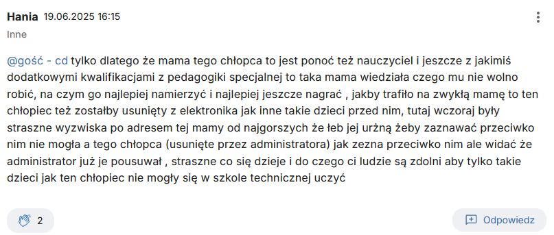 „tylko dlatego że mama tego chłopca to jest ponoć też nauczyciel i jeszcze z jakimiś dodatkowymi kwalifikacjami z pedagogiki specjalnej to taka mama wiedziała czego mu nie wolno robić, na czym go najlepiej namierzyć i najlepiej jeszcze nagrać , jakby trafiło na zwykłą mamę to ten chłopiec też zostałby usunięty z elektronika jak inne takie dzieci przed nim, tutaj wczoraj były straszne wyzwiska po adresem tej mamy od najgorszych że łeb jej urżną żeby zaznawać przeciwko nim nie mogła a tego chłopca (usunięte przez administratora) jak zezna przeciwko nim ale widać że administrator już je pousuwał , straszne co się dzieje i do czego ci ludzie są zdolni aby tylko takie dzieci jak ten chłopiec nie mogły się w szkole technicznej uczyć”