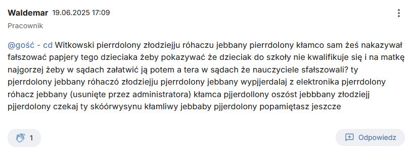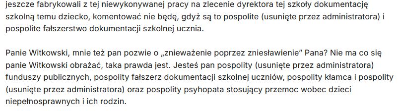 „Witkowski pierrdolony złodziejju róhaczu jebbany pierrdolony kłamco sam żeś nakazywał fałszować papjery tego dzieciaka żeby pokazywać że dzieciak do szkoły nie kwalifikuje się i na matkę najgorzej żeby w sądach załatwić ją potem a tera w sądach że nauczyciele sfałszowali? ty pjerrdolony jebbany róhaczó złodziejju pjerrdolony jebbany wypjjerdalaj z elektronika pjerrdolony róhacz jebbany (usunięte przez administratora) kłamca pjjerdollony oszóst jebbbany złodziejj pjjerdolony czekaj ty skóórwysynu kłamliwy jebbaby pjjerdolony popamiętasz jeszcze”