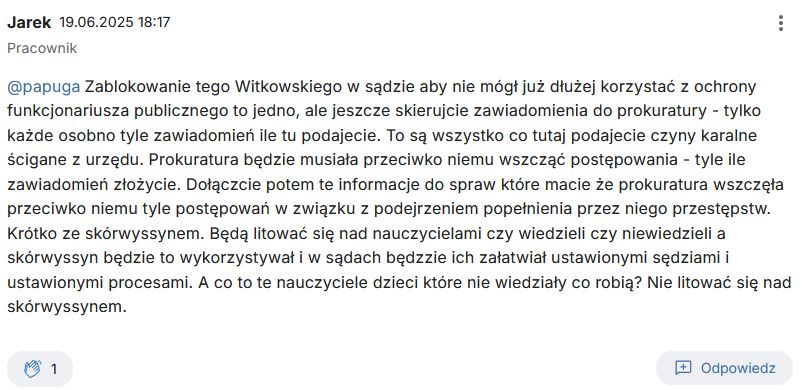 „Zablokowanie tego Witkowskiego w sądzie aby nie mógł już dłużej korzystać z ochrony funkcjonariusza publicznego to jedno, ale jeszcze skierujcie zawiadomienia do prokuratury – tylko każde osobno tyle zawiadomień ile tu podajecie. To są wszystko co tutaj podajecie czyny karalne ścigane z urzędu. Prokuratura będzie musiała przeciwko niemu wszcząć postępowania – tyle ile zawiadomień złożycie. Dołączcie potem te informacje do spraw które macie że prokuratura wszczęła przeciwko niemu tyle postępowań w związku z podejrzeniem popełnienia przez niego przestępstw. Krótko ze skórwyssynem. Będą litować się nad nauczycielami czy wiedzieli czy niewiedzieli a skórwyssyn będzie to wykorzystywał i w sądach będzzie ich załatwiał ustawionymi sędziami i ustawionymi procesami. A co to te nauczyciele dzieci które nie wiedziały co robią? Nie litować się nad skórwyssynem.”