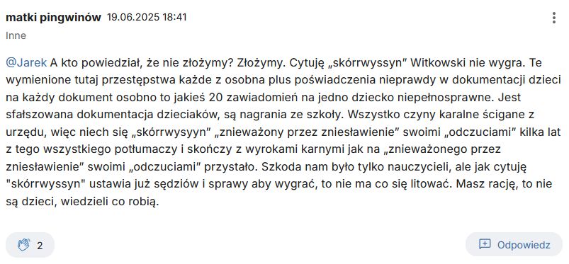„A kto powiedział, że nie złożymy? Złożymy. Cytuję „skórrwyssyn” Witkowski nie wygra. Te wymienione tutaj przestępstwa każde z osobna plus poświadczenia nieprawdy w dokumentacji dzieci na każdy dokument osobno to jakieś 20 zawiadomień na jedno dziecko niepełnosprawne. Jest sfałszowana dokumentacja dzieciaków, są nagrania ze szkoły. Wszystko czyny karalne ścigane z urzędu, więc niech się „skórrwysyyn” „znieważony przez zniesławienie” swoimi „odczuciami” kilka lat z tego wszystkiego potłumaczy i skończy z wyrokami karnymi jak na „znieważonego przez zniesławienie” swoimi „odczuciami” przystało. Szkoda nam było tylko nauczycieli, ale jak cytuję „skórrwyssyn” ustawia już sędziów i sprawy aby wygrać, to nie ma co się litować. Masz rację, to nie są dzieci, wiedzieli co robią.”