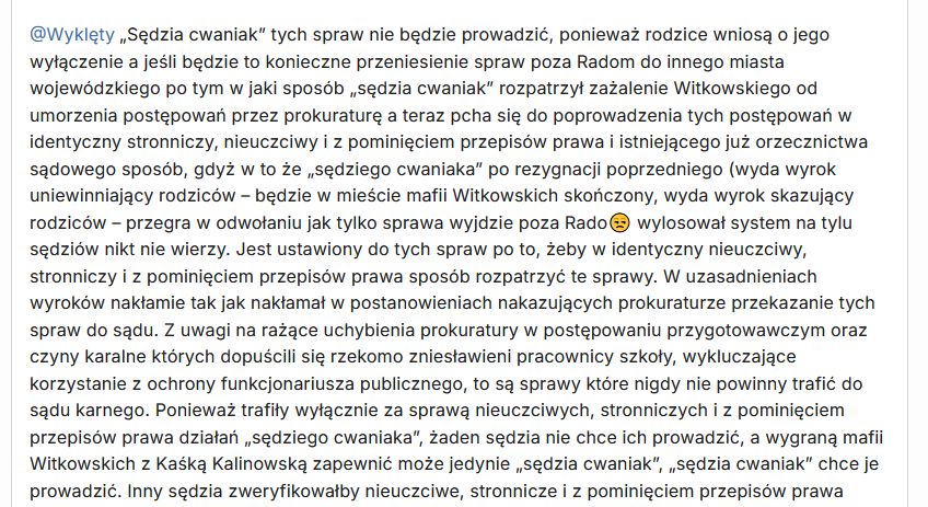 „„Sędzia cwaniak” tych spraw nie będzie prowadzić, ponieważ rodzice wniosą o jego wyłączenie a jeśli będzie to konieczne przeniesienie spraw poza Radom do innego miasta wojewódzkiego po tym w jaki sposób „sędzia cwaniak” rozpatrzył zażalenie Witkowskiego od umorzenia postępowań przez prokuraturę a teraz pcha się do poprowadzenia tych postępowań w identyczny stronniczy, nieuczciwy i z pominięciem przepisów prawa i istniejącego już orzecznictwa sądowego sposób, gdyż w to że „sędziego cwaniaka” po rezygnacji poprzedniego (wyda wyrok uniewinniający rodziców – będzie w mieście mafii Witkowskich skończony, wyda wyrok skazujący rodziców – przegra w odwołaniu jak tylko sprawa wyjdzie poza Rado😒 wylosował system na tylu sędziów nikt nie wierzy. Jest ustawiony do tych spraw po to, żeby w identyczny nieuczciwy, stronniczy i z pominięciem przepisów prawa sposób rozpatrzyć te sprawy. W uzasadnieniach wyroków nakłamie tak jak nakłamał w postanowieniach nakazujących prokuraturze przekazanie tych spraw do sądu. Z uwagi na rażące uchybienia prokuratury w postępowaniu przygotowawczym oraz czyny karalne których dopuścili się rzekomo zniesławieni pracownicy szkoły, wykluczające korzystanie z ochrony funkcjonariusza publicznego, to są sprawy które nigdy nie powinny trafić do sądu karnego. Ponieważ trafiły wyłącznie za sprawą nieuczciwych, stronniczych i z pominięciem przepisów prawa działań „sędziego cwaniaka”, żaden sędzia nie chce ich prowadzić, a wygraną mafii Witkowskich z Kaśką Kalinowską zapewnić może jedynie „sędzia cwaniak”, „sędzia cwaniak” chce je prowadzić. Inny sędzia zweryfikowałby nieuczciwe, stronnicze i z pominięciem przepisów prawa działania „sędziego cwaniaka” już na pierwszej rozprawie, więc aby taką możliwość wykluczyć „sędzia cwaniak” sam te sprawy chce poprowadzić. Będzie je prowadził dokładnie tak, jak rozpatrzył zażalenie Witkowskiego na umorzenie tych postępowań przez prokuraturę, czyli w sposób nieuczciwy, stronniczy i z pominięciem przepisów prawa, bazując wyłącznie na kłamstwach Witkowskiego i sfabrykowanej dokumentacji szkolnej uczniów. „Sędzia cwaniak” chroni w tym momencie własne cztery litery, gdyż skierowanie do tych spraw niezawisłego i sprawiedliwego sędziego skutkować będzie cofnięciem ich do prokuratury celem ponownego rozpatrzenia, a to, w świetle zgromadzonego przez rodziców materiału dowodowego (nie ma go jeszcze w aktach spraw więc „sędzia cwaniak” dopiero zobaczy co go czeka i w jakie g… wdepnął uwzględniając zażalenie Witkowskiego na umorzenie tych spraw przez prokuraturę) skutkować będzie postawieniem zarzutów karnych Witkowskiemu i reszcie rzekomo znieważanych pracowników tej szkoły. To są tak żenujące machlojki ze strony mafii Witkowskich i Kaśki Kalinowskiej aby zamieść pod dywan przestępstwa Witkowskiego i pracowników tej szkoły, które jedynie utwierdzają w przekonaniu, że rodzice mają rację i jeśli sprawą zajmie się niezawisły i obiektywny sędzia, Witkowski i reszta pracowników tej szkoły za to co zrobili dzieciom niepełnosprawnym i ich rodzinom skończą z wyrokami karnymi, na co w pełni zasługują.