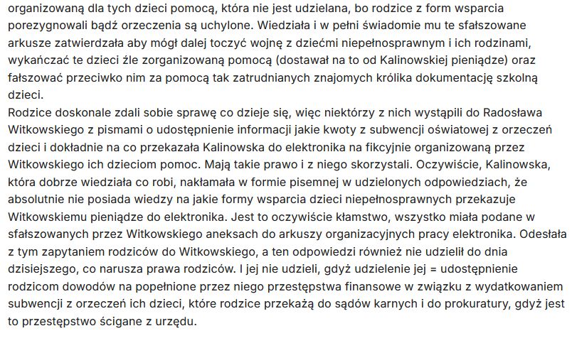Rodzice doskonale zdali sobie sprawę co dzieje się, więc niektórzy z nich wystąpili do Radosława Witkowskiego z pismami o udostępnienie informacji jakie kwoty z subwencji oświatowej z orzeczeń dzieci i dokładnie na co przekazała Kalinowska do elektronika na fikcyjnie organizowaną przez Witkowskiego ich dzieciom pomoc. Mają takie prawo i z niego skorzystali. Oczywiście, Kalinowska, która dobrze wiedziała co robi, nakłamała w formie pisemnej w udzielonych odpowiedziach, że absolutnie nie posiada wiedzy na jakie formy wsparcia dzieci niepełnosprawnych przekazuje Witkowskiemu pieniądze do elektronika. Jest to oczywiście kłamstwo, wszystko miała podane w sfałszowanych przez Witkowskiego aneksach do arkuszy organizacyjnych pracy elektronika. Odesłała z tym zapytaniem rodziców do Witkowskiego, a ten odpowiedzi również nie udzielił do dnia dzisiejszego, co narusza prawa rodziców. I jej nie udzieli, gdyż udzielenie jej = udostępnienie rodzicom dowodów na popełnione przez niego przestępstwa finansowe w związku z wydatkowaniem subwencji z orzeczeń ich dzieci, które rodzice przekażą do sądów karnych i do prokuratury, gdyż jest to przestępstwo ścigane z urzędu.”