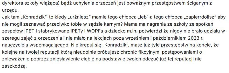 Jak tam „Konradzik”, to kiedy „urżniesz” mamie tego chłopca „łeb” a tego chłopca „zapierrdolisz” aby nie mogli zeznawać przeciwko tobie w sądzie karnym? Mama ma nagrania ze szkoły ze spotkań zespołów IPET i sfabrykowane IPETy i WOPFa a dziecko m.in. potwierdzi że nigdy nie brało udziału w szeregu zajęć z orzeczenia i nie miało na lekcjach poza wrześniem i październikiem 2023 r. nauczyciela wspomagającego. Nie krępuj się „Konradzik”, masz już tyle przestępstw na koncie, że kolejne na twojej reputacji którą nieudolnie próbujesz chronić fikcyjnymi postępowaniami o znieważenie poprzez zniesławienie ciebie na podstawie twoich odczuć już tej reputacji nie zaszkodzą.” -