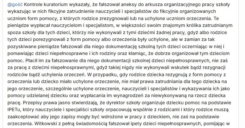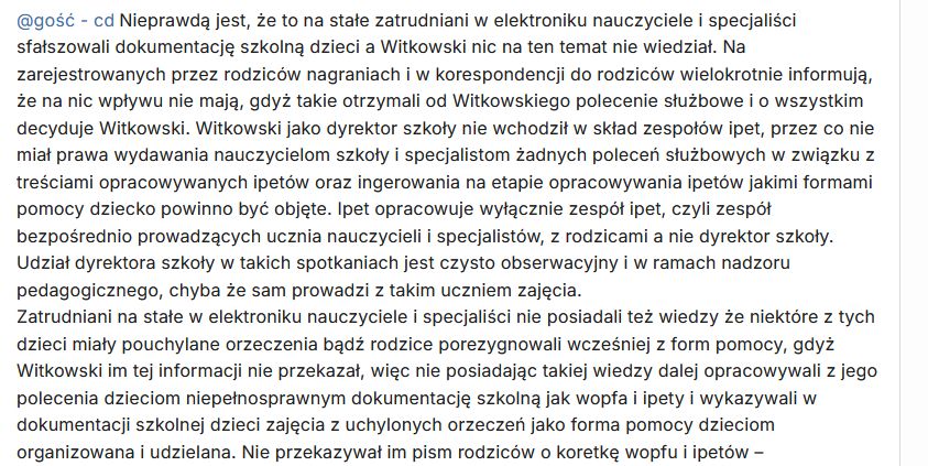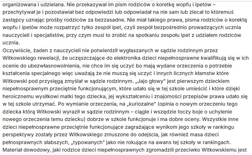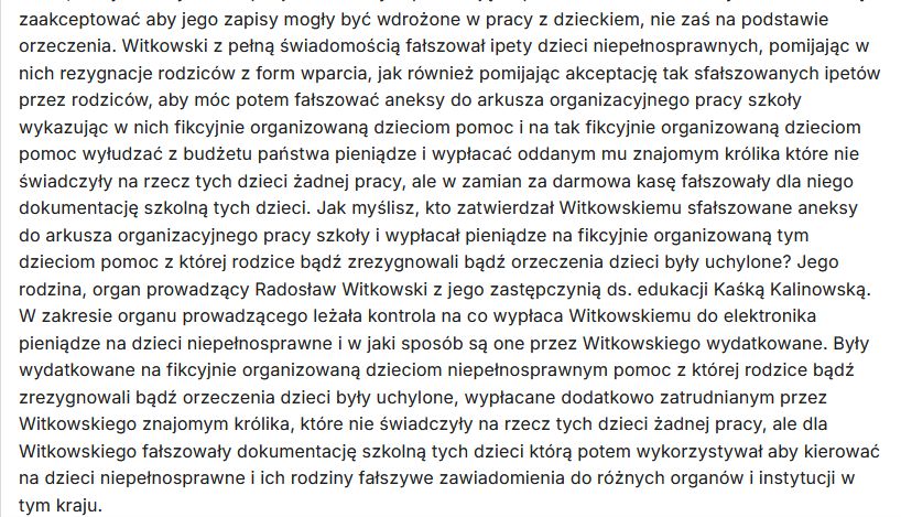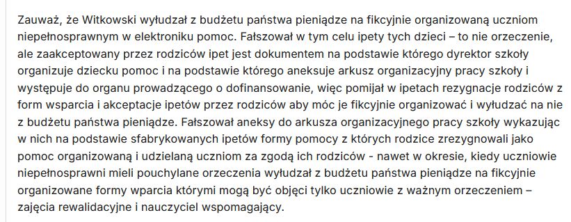 Zauważ, że Witkowski wyłudzał z budżetu państwa pieniądze na fikcyjnie organizowaną uczniom niepełnosprawnym w elektroniku pomoc. Fałszował w tym celu ipety tych dzieci – to nie orzeczenie, ale zaakceptowany przez rodziców ipet jest dokumentem na podstawie którego dyrektor szkoły organizuje dziecku pomoc i na podstawie którego aneksuje arkusz organizacyjny pracy szkoły i występuje do organu prowadzącego o dofinansowanie, więc pomijał w ipetach rezygnacje rodziców z form wsparcia i akceptacje ipetów przez rodziców aby móc je fikcyjnie organizować i wyłudzać na nie z budżetu państwa pieniądze. Fałszował aneksy do arkusza organizacyjnego pracy szkoły wykazując w nich na podstawie sfabrykowanych ipetów formy pomocy z których rodzice zrezygnowali jako pomoc organizowaną i udzielaną uczniom za zgodą ich rodziców – nawet w okresie, kiedy uczniowie niepełnosprawni mieli pouchylane orzeczenia wyłudzał z budżetu państwa pieniądze na fikcyjnie organizowane formy wparcia którymi mogą być objęci tylko uczniowie z ważnym orzeczeniem – zajęcia rewalidacyjne i nauczyciel wspomagający.