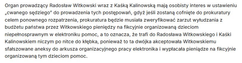 Organ prowadzący Radosław Witkowski wraz z Kaśką Kalinowską mają osobisty interes w ustawieniu „cwanego sędziego” do prowadzenia tych postępowań, gdyż jeśli zostaną cofnięte do prokuratury celem ponownego rozpatrzenia, prokuratura będzie musiała zweryfikować zarzut wyłudzania z budżetu państwa przez Witkowskiego pieniędzy na fikcyjnie organizowaną dzieciom niepełnosprawnym w elektroniku pomoc, a to oznacza, że trafi do Radosława Witkowskiego i Kaśki Kalinowskiem niczym po nitce do kłębka, ponieważ to ta dwójka akceptowała Witkowskiemu sfałszowane aneksy do arkusza organizacyjnego pracy elektronika i wypłacała pieniądze na fikcyjnie organizowaną tym dzieciom pomoc.